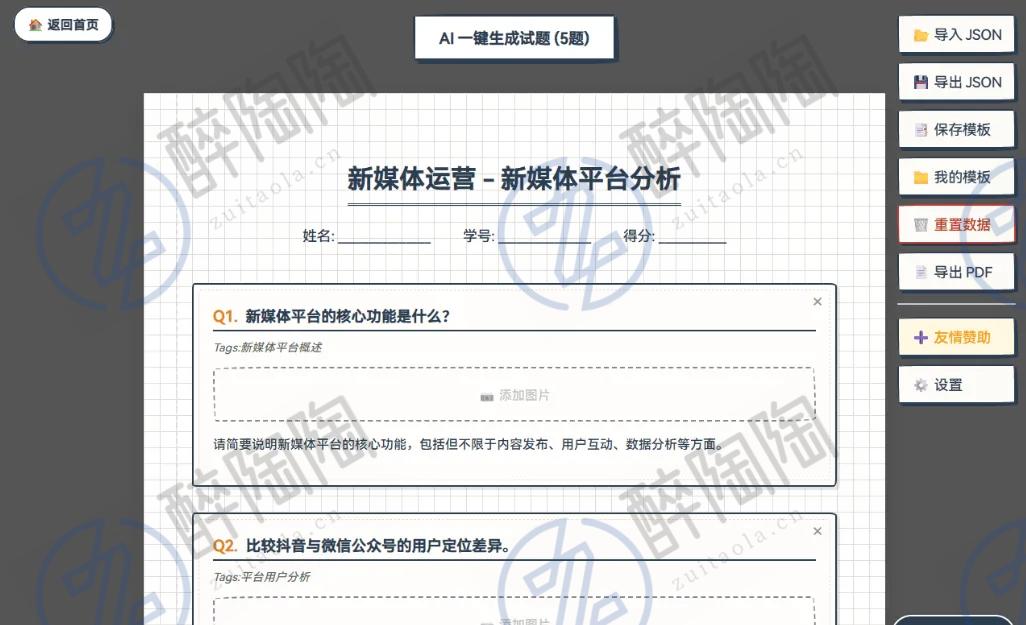 高清排版:利用 jspdf 与 html2canvas 组合技术,支持生成高质量 PDF 试卷。