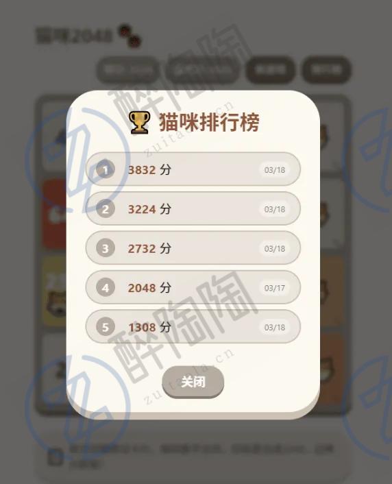 便捷操作与视觉反馈:界面顶部实时显示当前得分和历史最高分,点击“新游戏”可随时重启。胜利时弹出萌系弹窗,点击“喵~”即可关闭。排行榜按钮可随时查看历史最佳成绩,弹窗设计圆润可爱,与游戏风格一致。