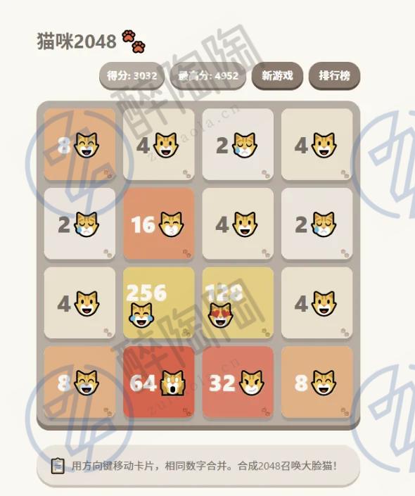 猫咪主题特色:每个数字都配有专属猫咪表情——随着数字增长,表情逐渐升级。方块颜色也延续经典2048的暖色系,并点缀猫爪印,整体风格温馨活泼。