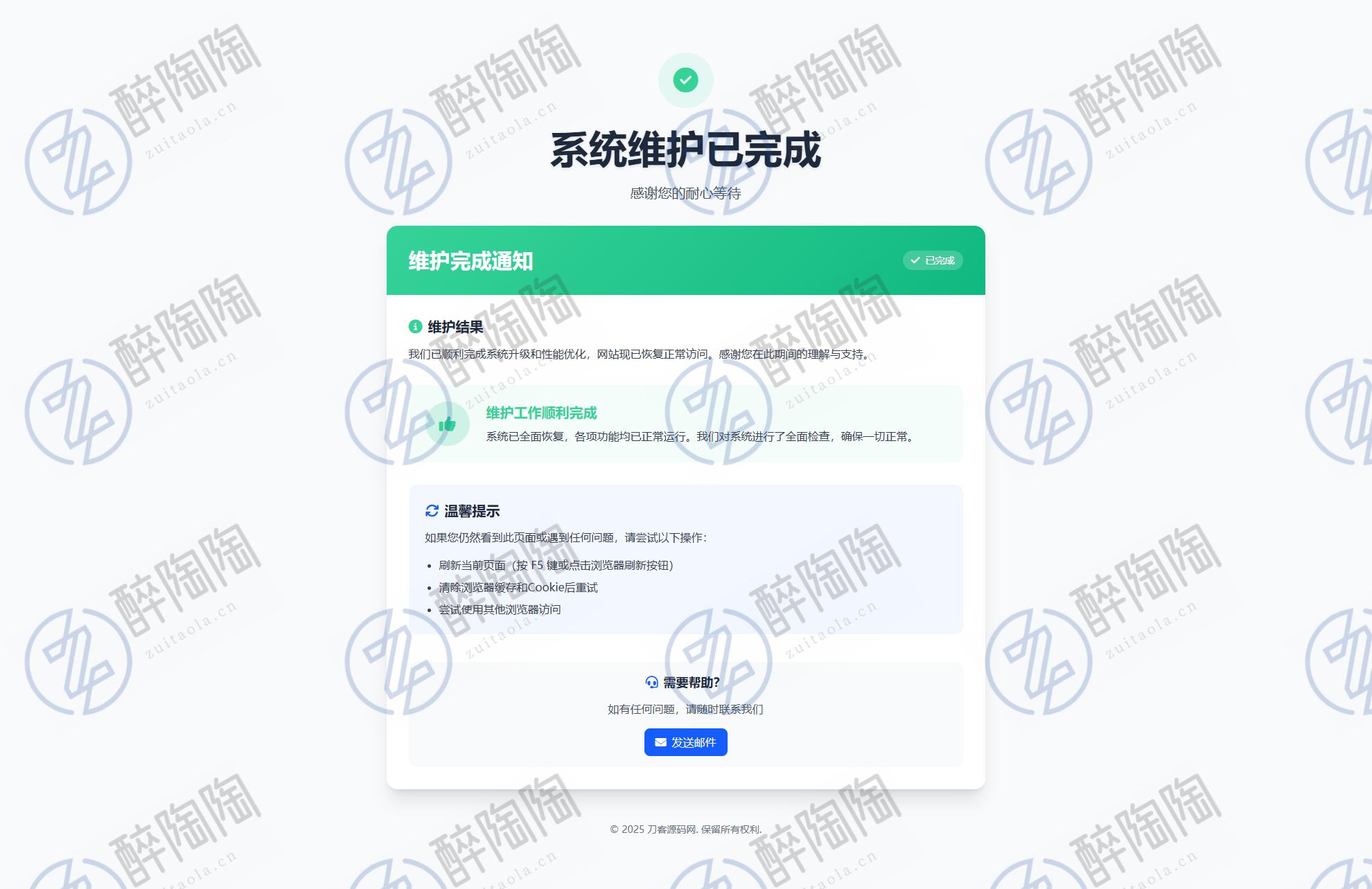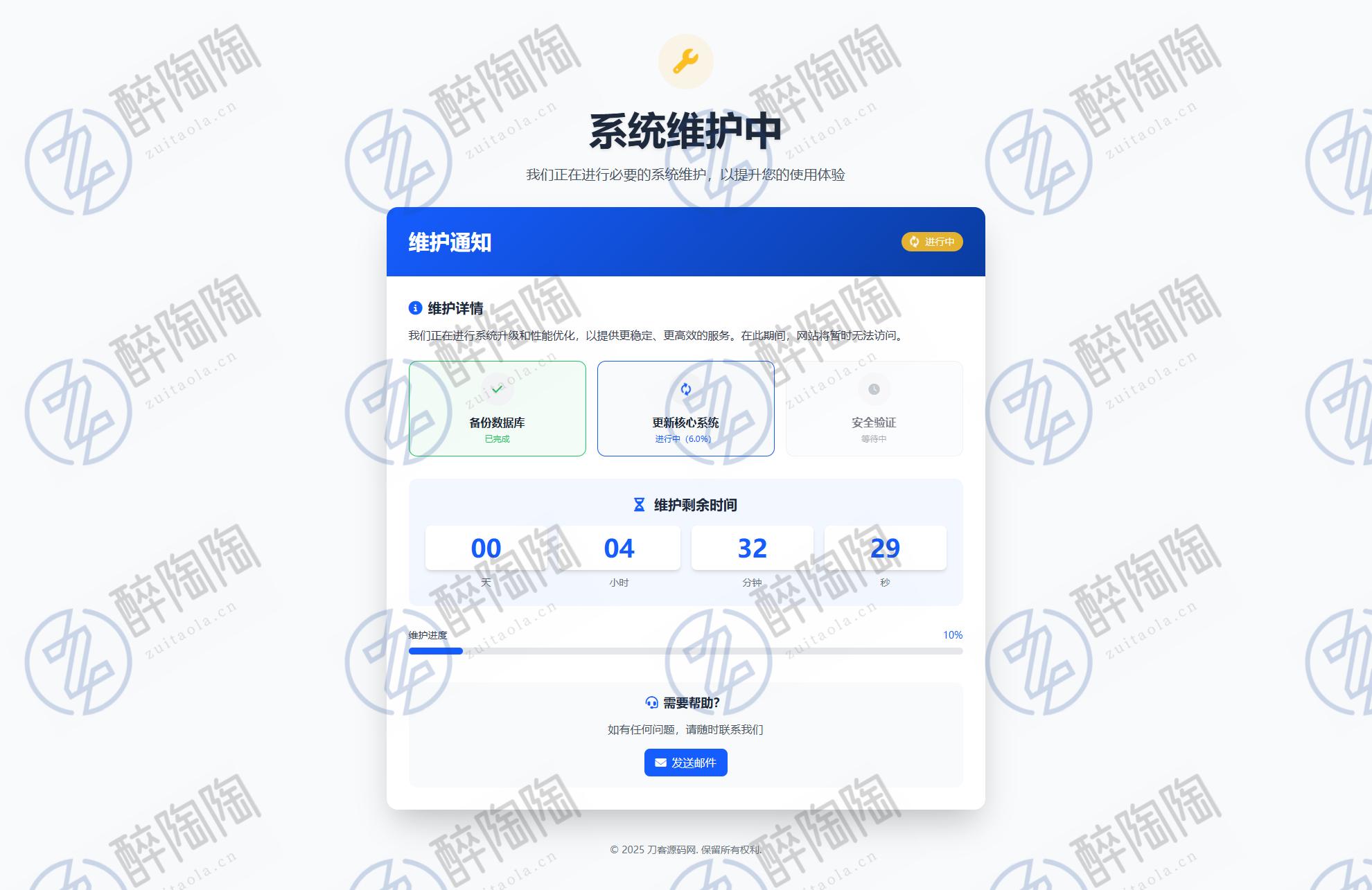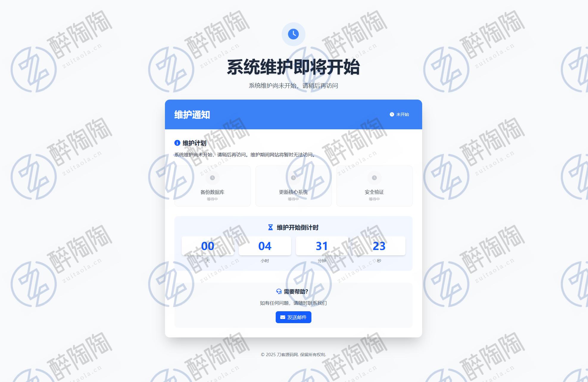 自适应手机和电脑端,页面简洁美观,有三个页面,维护前、维护中、维护完,无后台,内容在首页index文件修改