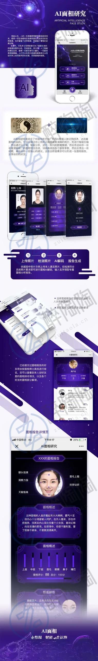 AI面相系统可以通过你上传的清晰正面、五官清晰、不戴眼镜、面部完整显现、无刘海遮挡照片,先进行扫描照片面部特征,头部姿势、左眼状态、右眼状态无误,再通过云计算智能分析,测量三庭长度、定位五官、综合分析,最后传送给你一份非常清晰明了的面相情况总结。详细具体到五官上庭、中庭、下庭、眉长、眼睛、鼻子、嘴巴、参数及评分,反馈出面相具体情况如五行面相、五行格局、流年运势,给你完整的面相事情运程报告、面相情感运程报告。这些分析结果你可以形成一张面相报告,分享给你的好友。微擎模块小程序系统!